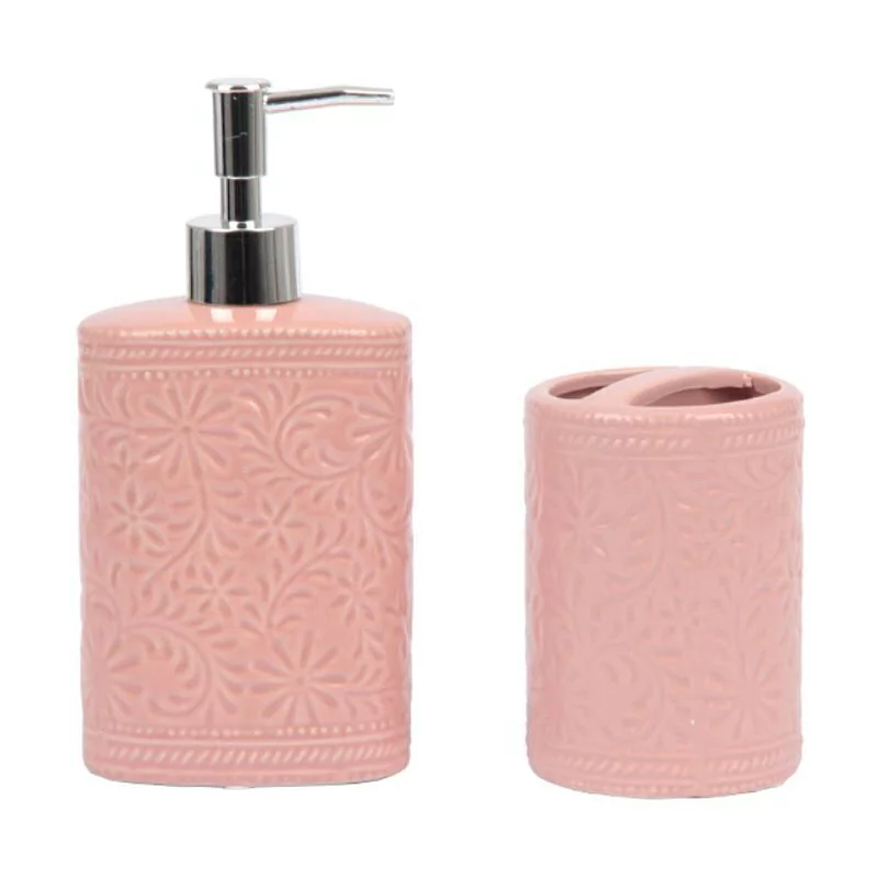 Este conjunto de cerâmica apresenta um dispenser de sabonete e um copo para escovas de dente, ambos com uma delicada estampa em relevo que adiciona um charme sofisticado ao ambiente.